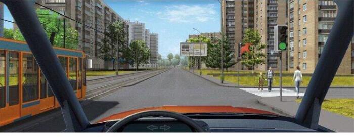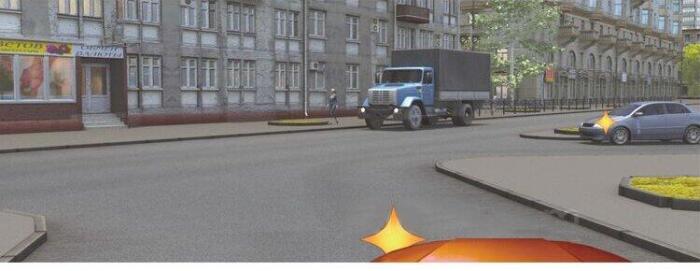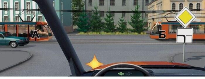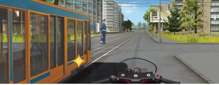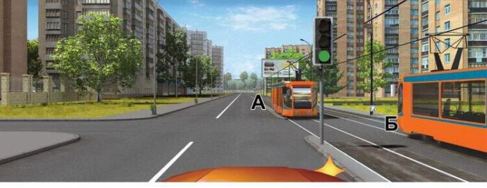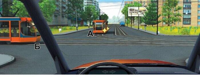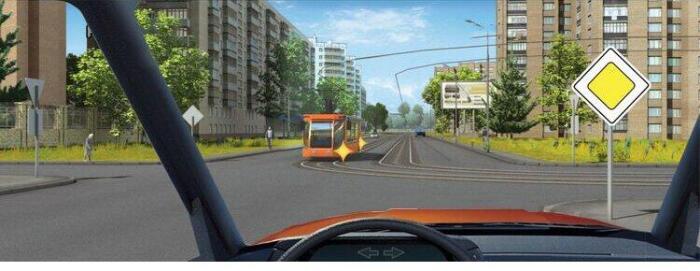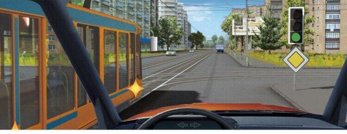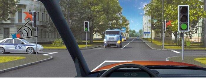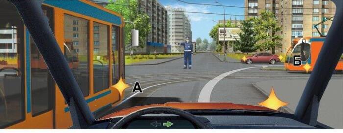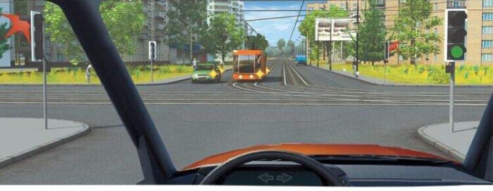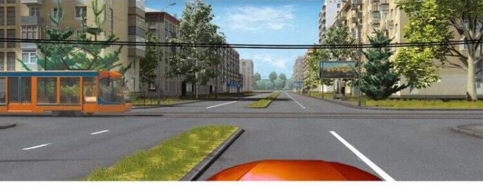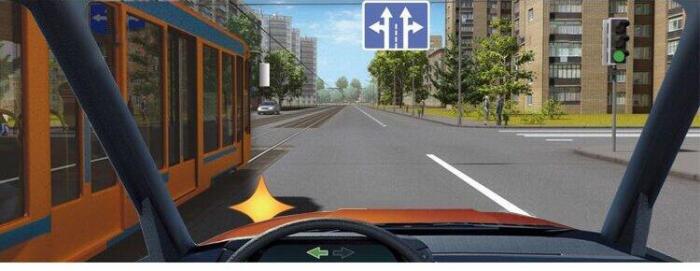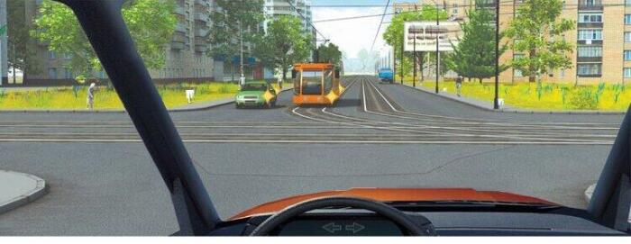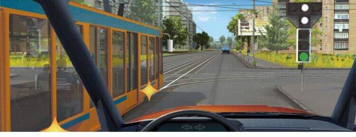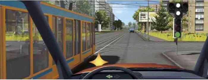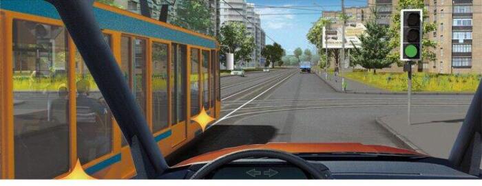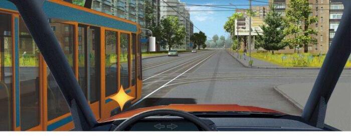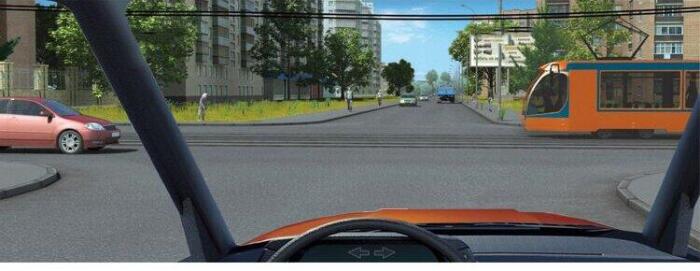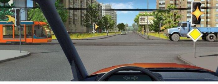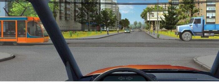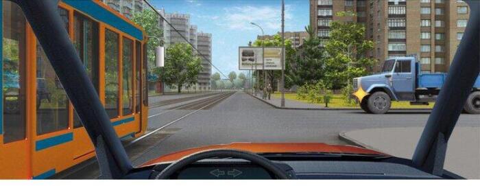 Проедете перекресток вместе с трамваем, не уступая дорогу грузовому автомобилю