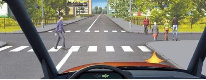 Выехав на перекресток, остановиться перед пешеходным переходом, чтобы пропустить пешеходов