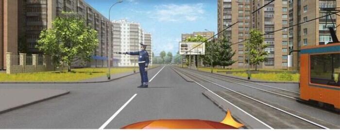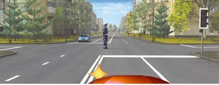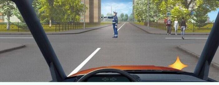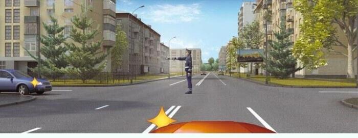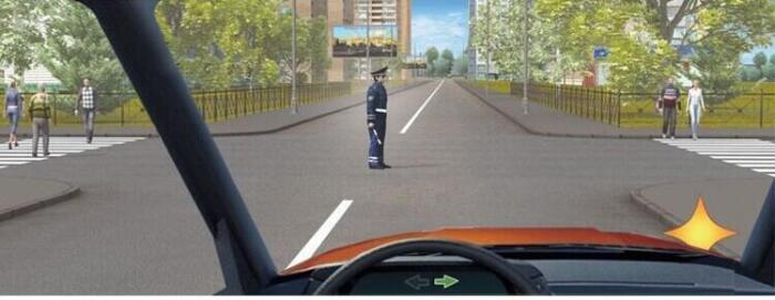 Остановитесь перед перекрестком и дождетесь другого сигнала регулировщика