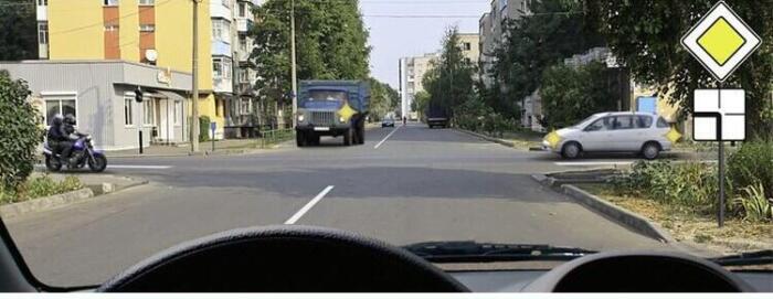 Уступите дорогу грузовому автомобилю, так как он находится на главной дороге