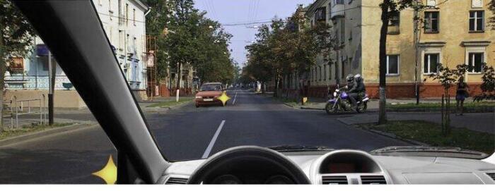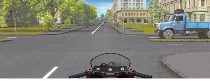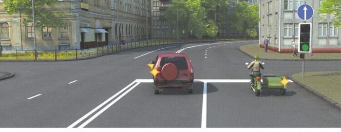 Проедете перекресток одновременно со встречным автомобилем до проезда мотоцикла