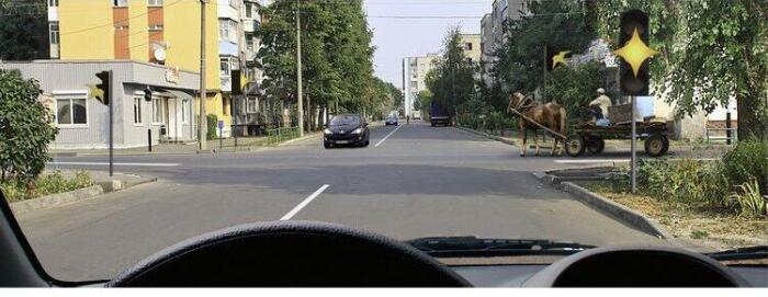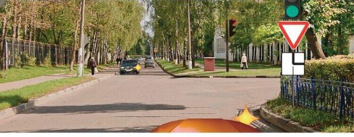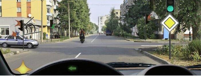 Вы намерены проехать перекрёсток в прямом направлении. Ваши действия?