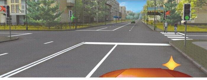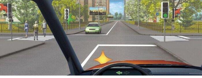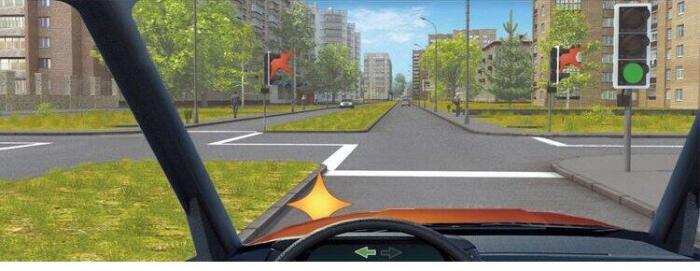 Начать движение, убедившись в отсутствии пешеходов и транспортных средств, завершающих движение после смены сигнала светофора