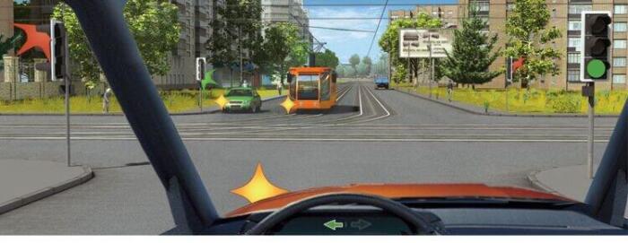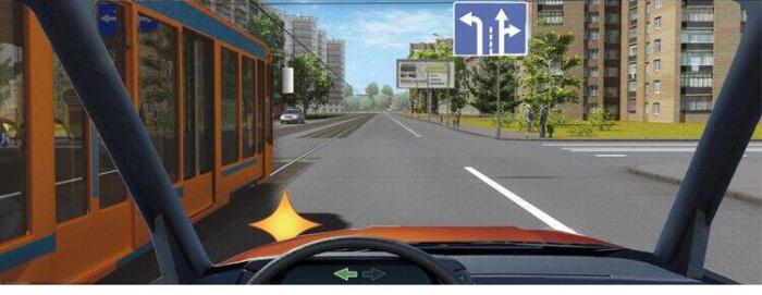 Уступите дорогу трамваю, выполнив поворот с левой полосы