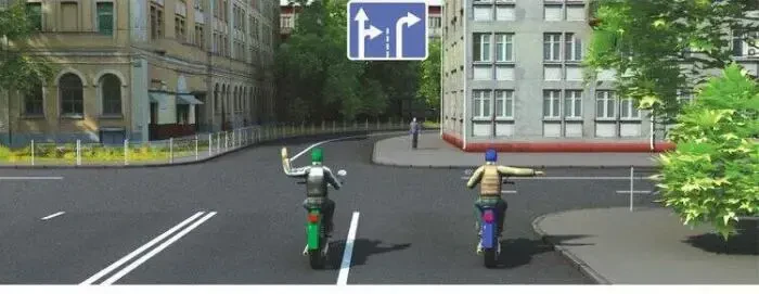 Такой сигнал рукой, подаваемый водителем мотоцикла, который движется по левой полосе, информирует о его намерении: